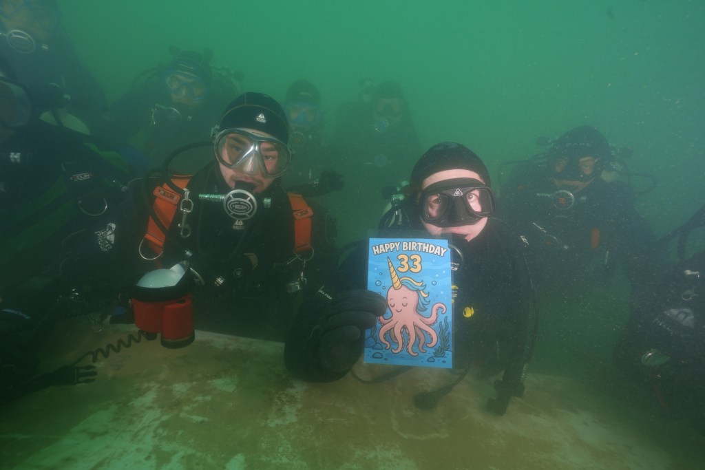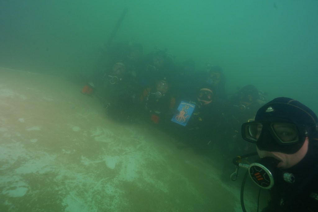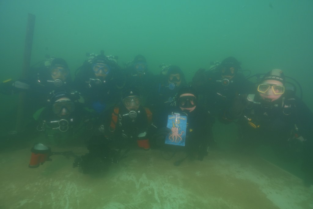 Ein freudiger Tauchgang war Christian B.s Geburtstagstauchgang. Nachdem sich die blubbernde Versammlung durch die leicht aufgewirbelte Sprungschicht auf die Plattform gekämpft hatte, konnte dort das Anstoßen losgehen und ihm seine Karte überreicht werden.