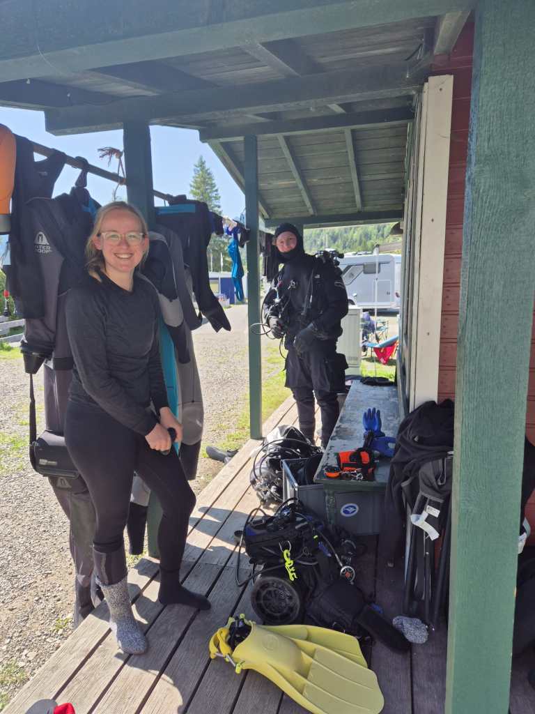 Der zweite Tag begann bei wenigen mit einem Early Morning Dive, bei zwei weiteren mit einem eiskalten Early Morning Apnoe. Nachdem beim Frühstück jeder über den neuesten Tratsch aufgeklärt wurde, konnte der zweite Tauchtag starten. Bei manchen war dieser geplant nass, bei anderen geplant trocken, und manche durften sich Sorgen um ihren nassen Trocki machen, der kostenlos von dem Grillfeuer der Nachbarn durchgeräuchert wurde.